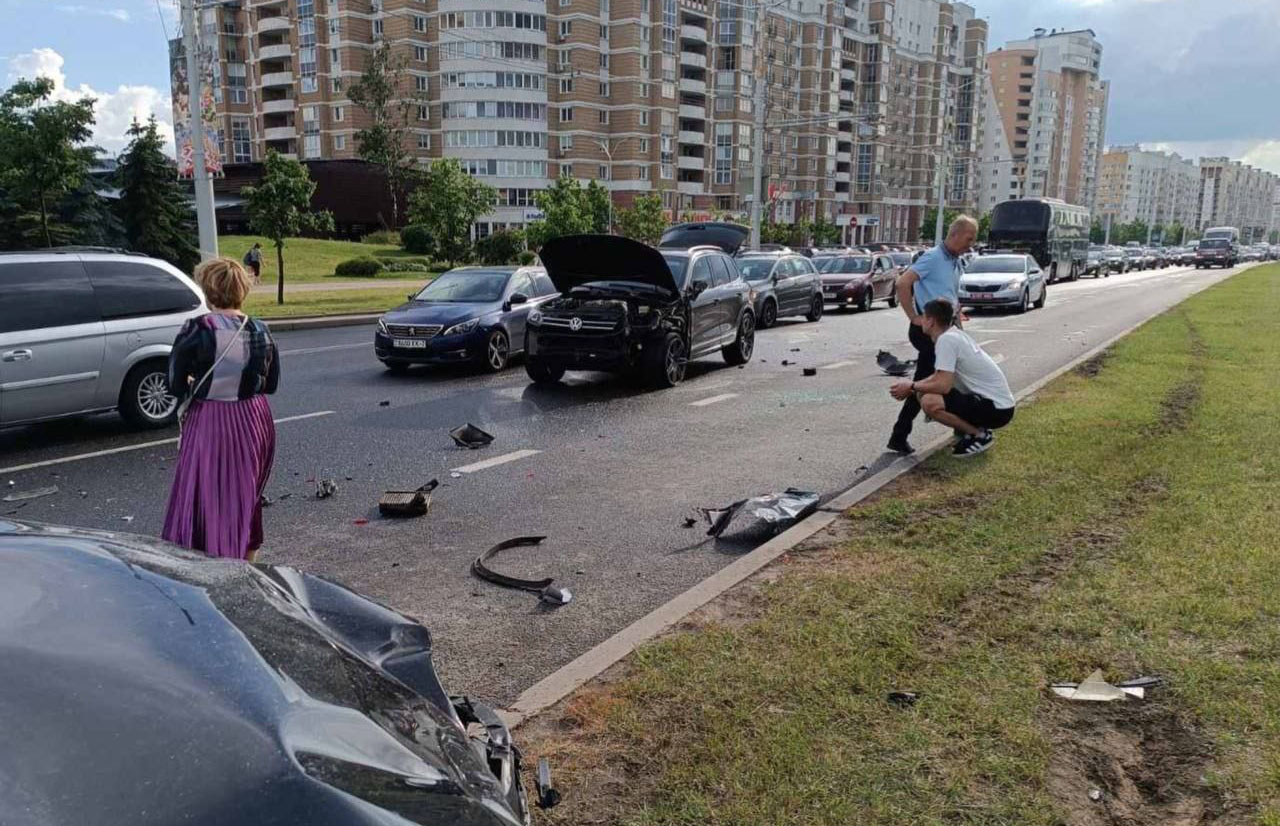 Около 17:05 24-летний мужчина на Volkswagen совершал перестроение на Притыцкого в сторону Якубовского. Он не предоставил преимущество Volvo, двигавшемуся в том же направлении. От удара водитель Volkswagen потерял управление и врезался в стоящие Opel, Audi, Mazda и Renault. Об этом информирует Telegram-канал «УГАИ ГУВД Мингорисполкома».