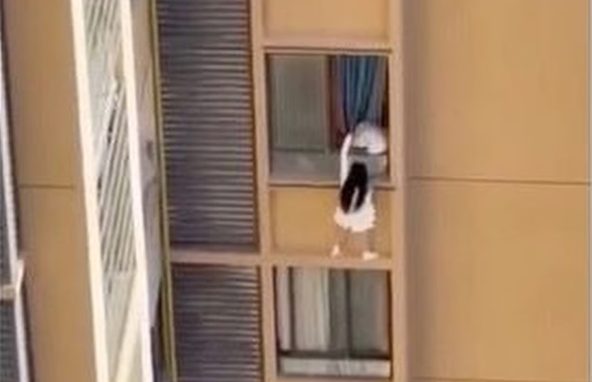 Девушка ухватилась за карниз и перебралась к водосточной трубе, намереваясь спуститься, но начала скользить. Удержавшись на фасаде с трудом, она смогла зацепиться за балкон на девятом этаже. Затем она начала стучать в окно соседей, которые, услышав ее, втащили в квартиру. Все это было зафиксировано на видео, снятом жителями соседнего дома.