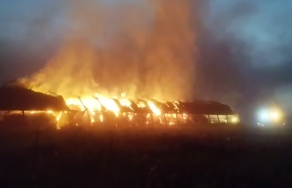 Огонь уничтожил 100 тонн сена в рулонах, также поврежден металлический каркас хранилища.
