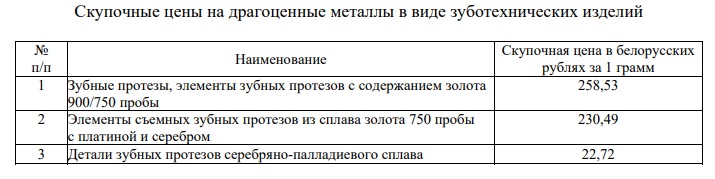 Отдельные скупочные цены установлены на драгметаллы в виде зуботехнических изделий.