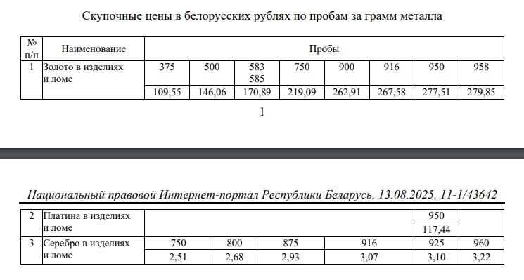 Новые цены на скупку драгоценных металлов у физлиц установлены в Беларуси