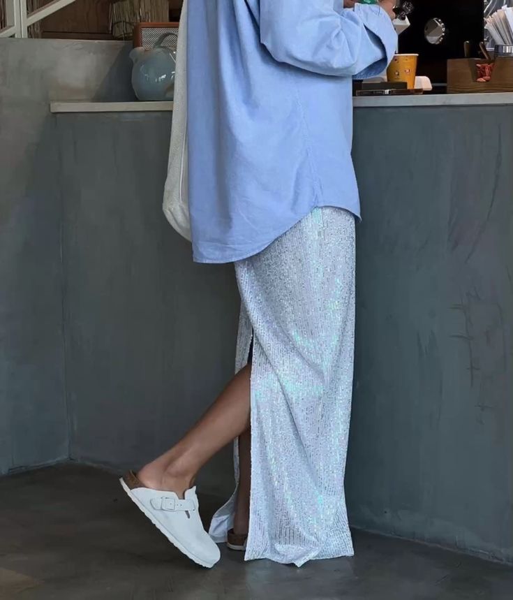 Первым ярким трендом сезона, который разбавит привычные туристические образы, может стать юбка или брюки с пайетками. Пайетки отлично разбавляют базу, а в качестве верха к подобным вещам подойдет базовая футболка, рубашка или строгий пиджак.