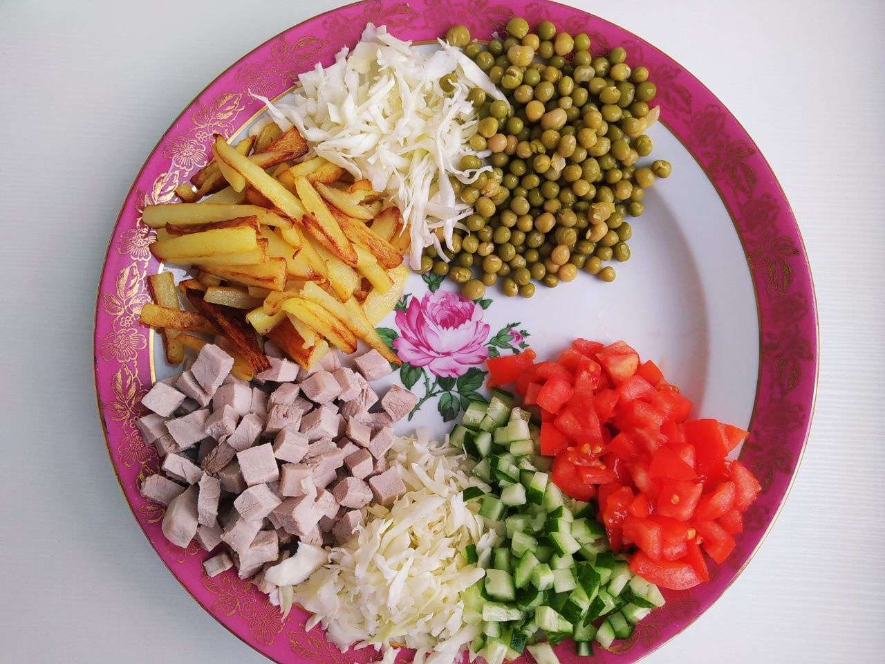 5. Помидор и огурец также нарезать кубиками и по очереди выложить к остальным ингредиентам.