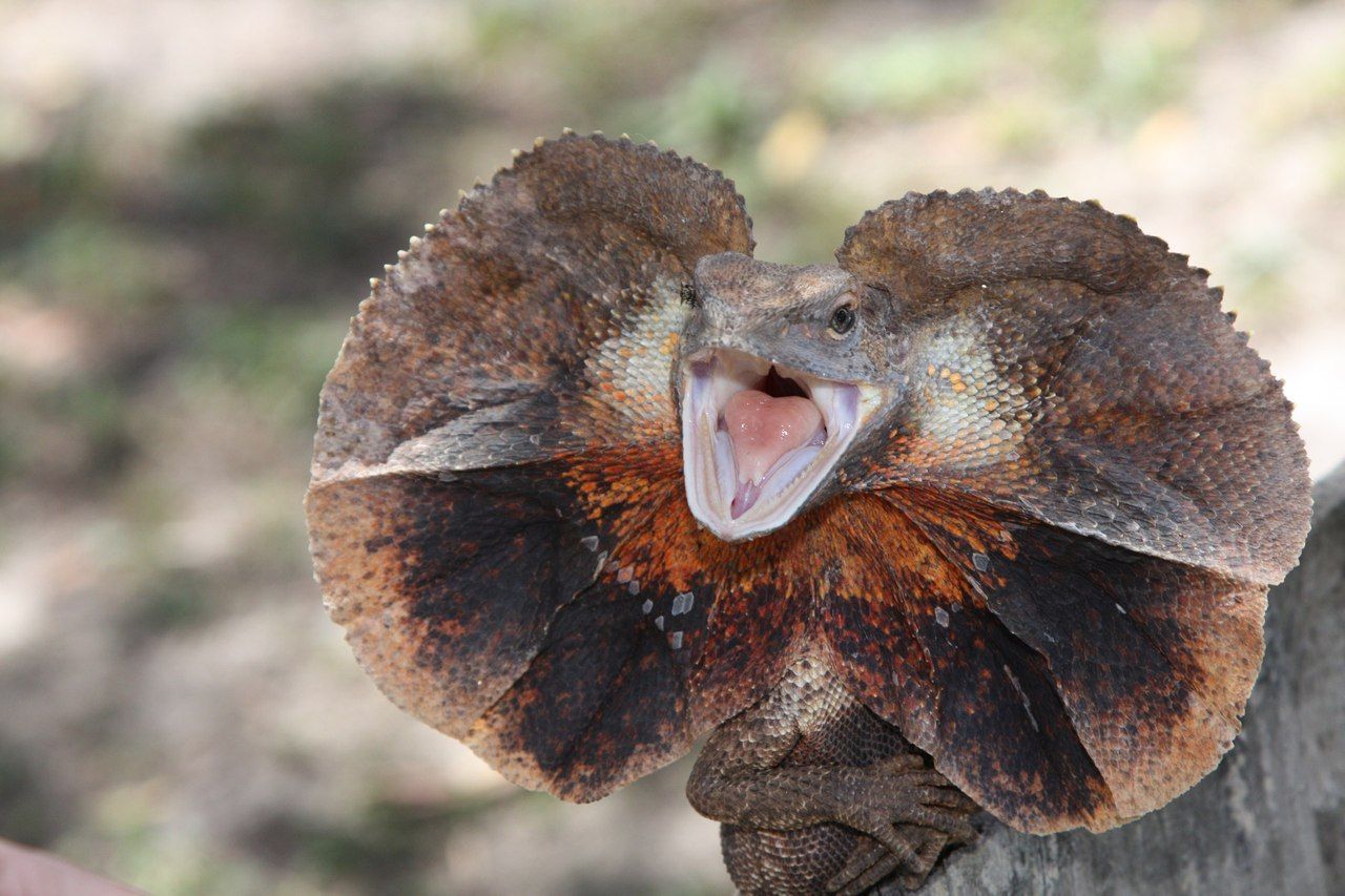 Ящерицу этого вида назвали плащеносной благодаря удивительной оборке с двух сторон шеи. При угрозе это существо расправляет свой «плащ», открывает рот и готовится к атаке. Выглядит жутко!
