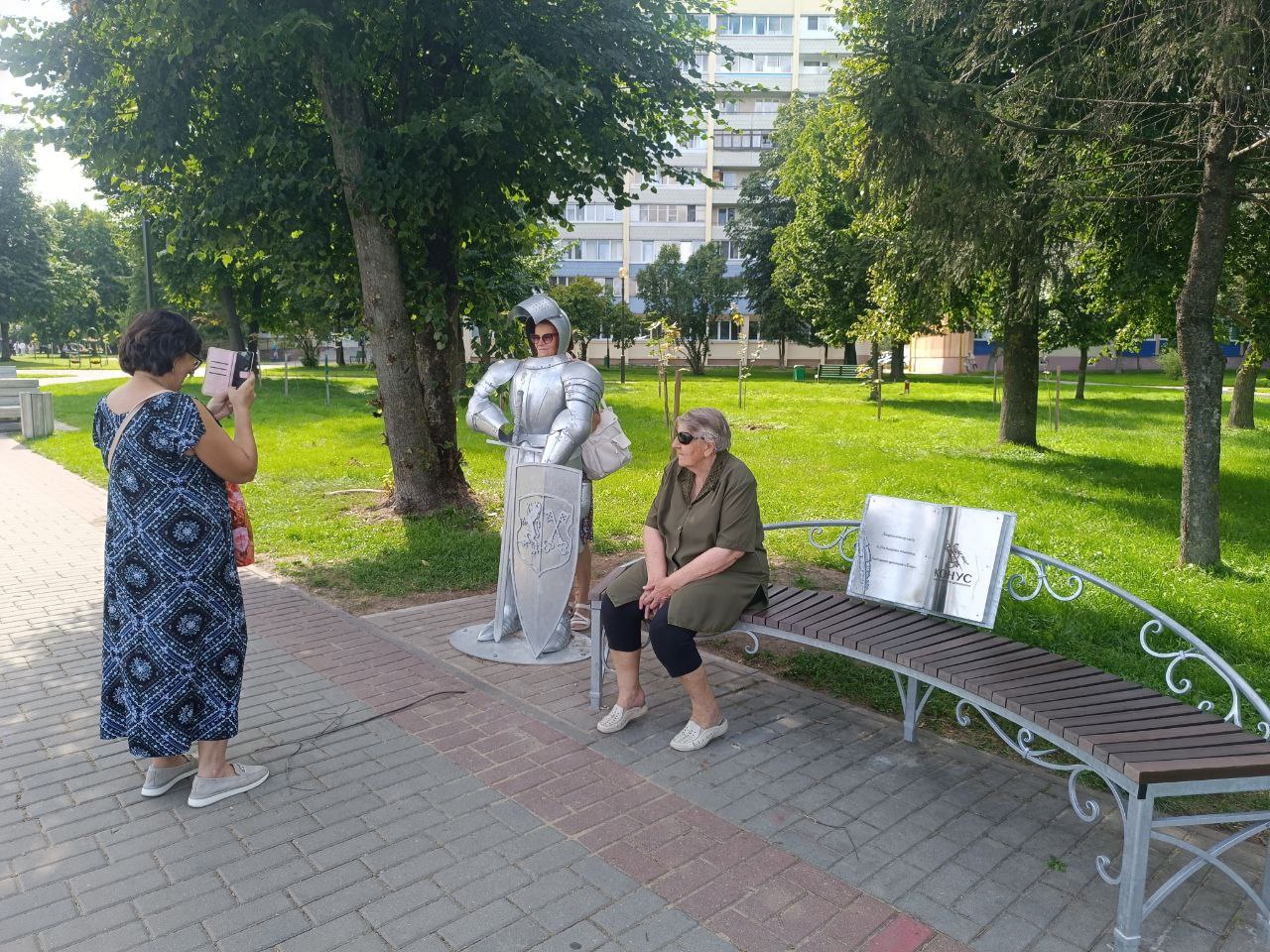 Шедевр от предприятия «Конус» словно «охраняет» рыцарь. Если быть точнее, рыцарем может стать каждый желающий, так как рядом со скамейкой от этой организации предусмотрена и фотозона.