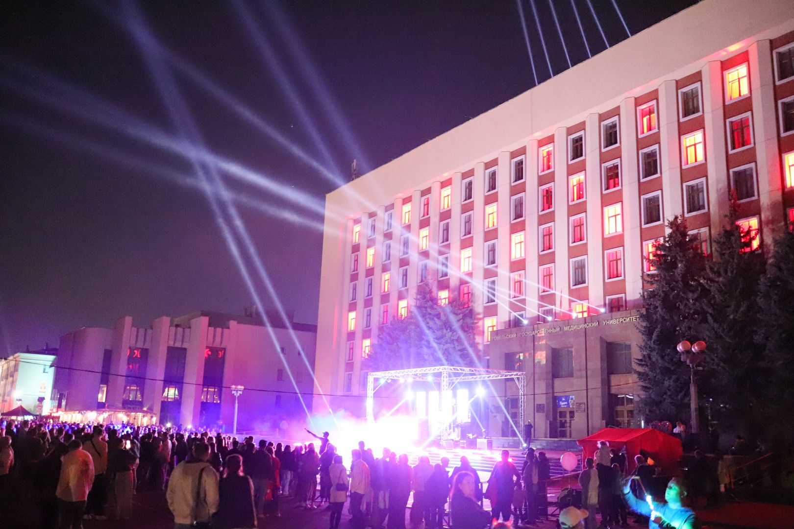 С 20:00 началось выступление диджеев, которое прервалось для одного из самых запоминающихся элементов праздника – светового шоу. При этом формат был выбран весьма необычным. Здание Гомельского медуниверситета превратилось в огромное световое табло, где роль «пикселей» выполняли окна здания, которые загорались разными цветами, создавая различные надписи и изображения.