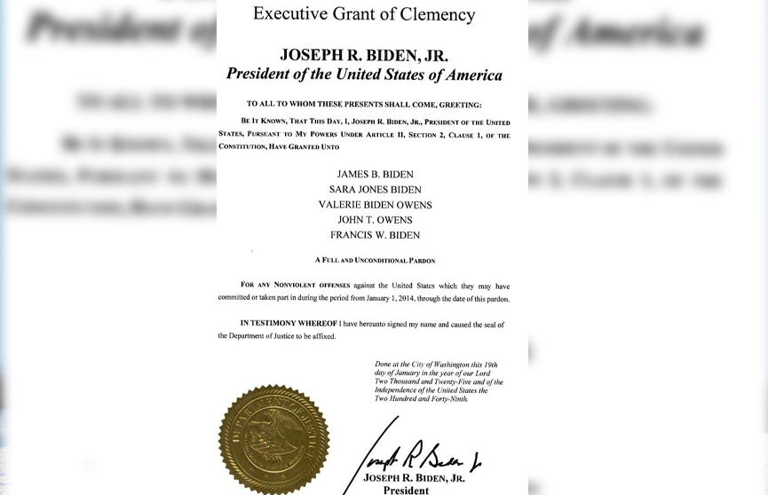 Указ Байдена, в котором он ссылается на Конституцию США, гласит о том, что указанные в документе лица в их деяниях признаются невиновными с «1 января 2014 по 19 января 2025 года».