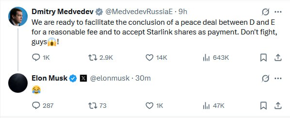 На происходящее отреагировал Дмитрий Медведев. На своей странице в соцсети Х он написал, что Россия готова помирить Маска и Трампа, а в качестве «разумной оплаты» за это может принять акции Starlink.
