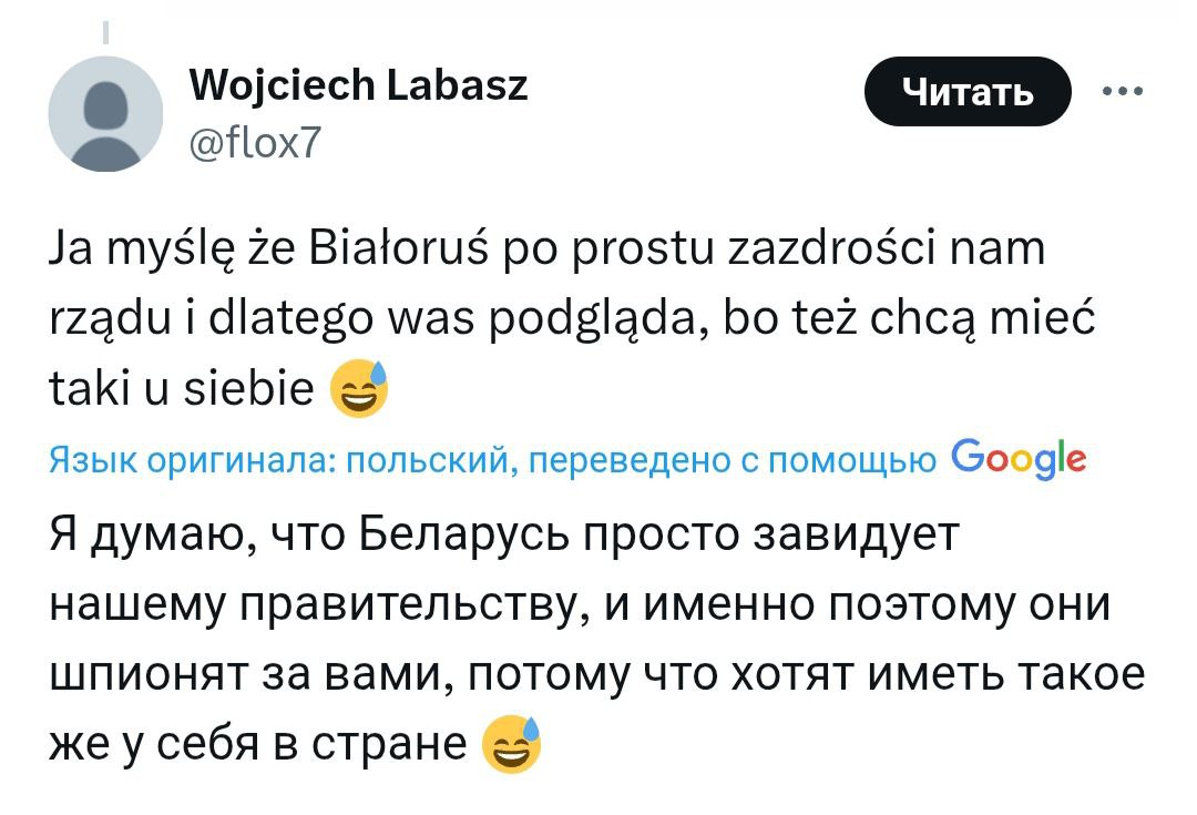 «Я думаю, белорусы просто нам завидуют, что у нас такое замечательное правительство, поэтому они и отправили дроны подсмотреть, как это оно так гениально управляют Польшей. Они тоже хотели бы таких правителей!» – сыронизировали в комментариях.