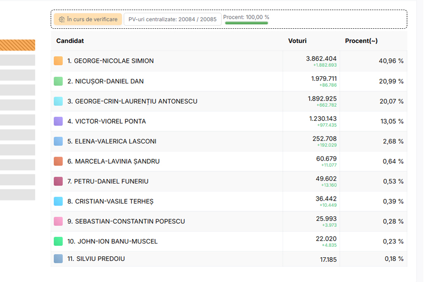 Согласно имеющейся информации, бесспорно лидировал глава «Альянса за объединение румын» (AUR) Джордже Симион, набравший большинство голосов избирателей. Впрочем, этого количества ему не хватит для того, чтобы стать президентом Румынии в первом же туре, поскольку для победы нужно набрать как минимум 50% и один голос.
