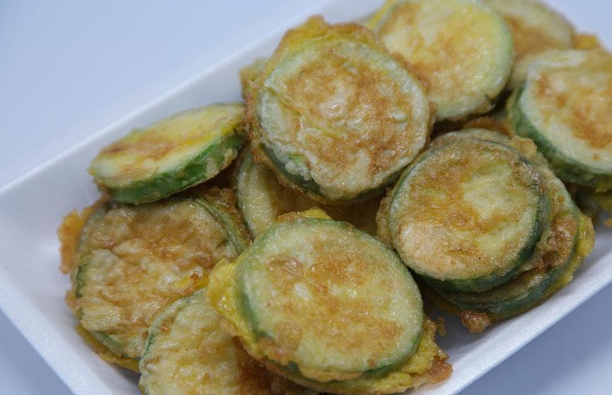 Молодые кабачки очистить от кожуры и нарезать кружками толщиной около 1 см. Посыпать солью и сушеным чесноком, слегка поперчить и дать постоять 10 минут, чтобы пустили сок. Слить жидкость. Затем обмакнуть каждый кружок сначала во взбитом яйце, а после – в смешанной с солью и вашими любимыми пряностями муке и обжарить до карамельной корочки с каждой стороны в растительном масле.