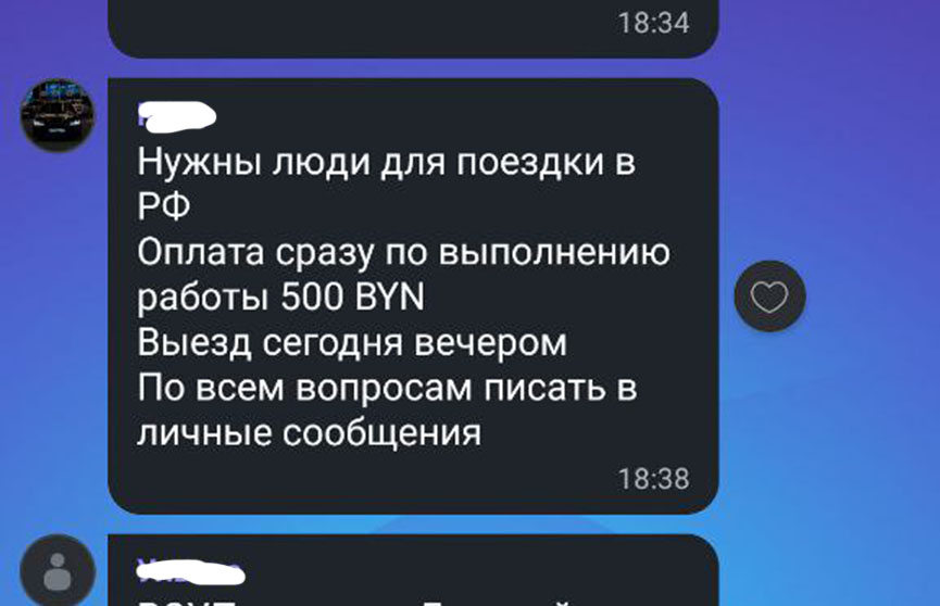 Итак, в одном из чатов мы нарвались на объявление о том, что нужны люди для поездки в Россию. Сразу после выполнения работы обещают заплатить 500 белорусских рублей.