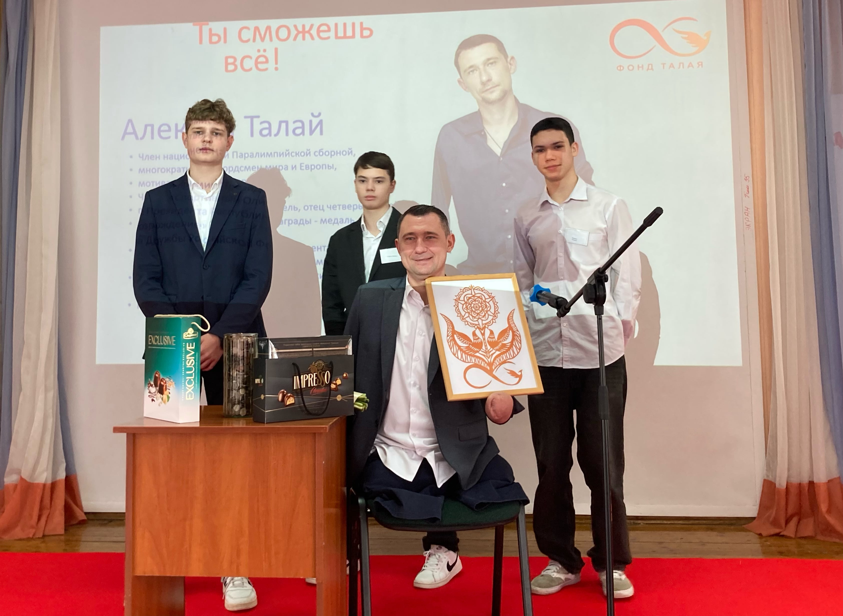 «Урок мужества» от Алексея Талая – это про ценность жизни, это про достижение целей несмотря на обстоятельства, это про пример неиссякаемой жизненной энергии и веры в лучшее. Школьники узнали много интересного о семье спикера, о его увлечениях и спортивных достижениях. Но только лишь разговорами дело не обошлось. Гость гимназистов рассказал и показал, как он, невзирая на состояние своего организма, выполняет простые бытовые навыки: пишет ручкой, пьет воду, кушает.