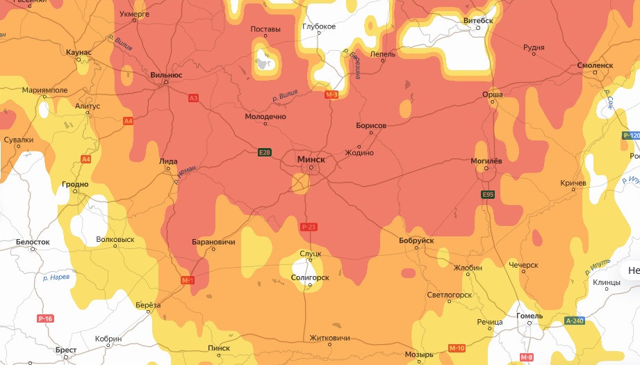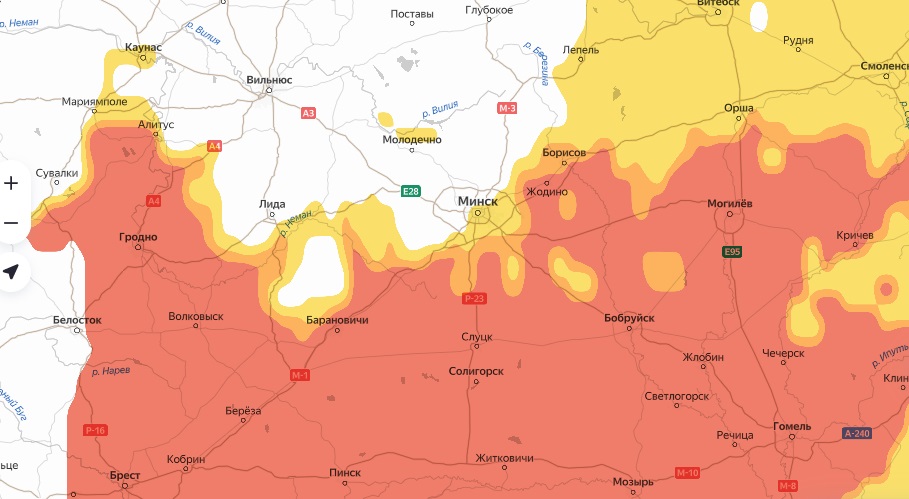 Во вторник, 10 июня, почти вся карта окрасилась в красный цвет. Больше всего под «удар» пыльцы попала центральная часть – столичный регион, Гродненщина и Могилевщина.