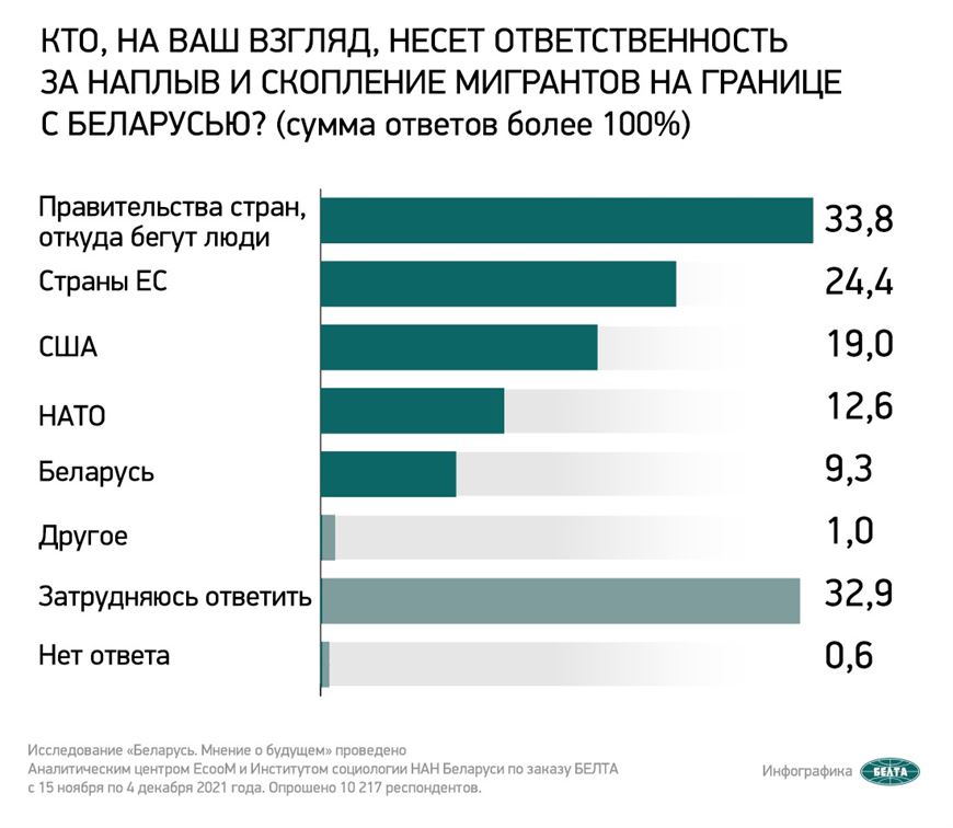 33,8% белорусов считают, что правительства стран, откуда бегут люди, несут ответственность за наплыв мигрантов. Кроме того, в числе виновников миграционного кризиса граждане называют и страны ЕС – 24,4%, США –19%, НАТО – 12,6%.