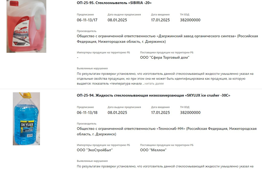 Два вида стеклоомывающей жидкости были внесены в реестр опасной продукции Госстандарта Беларуси.