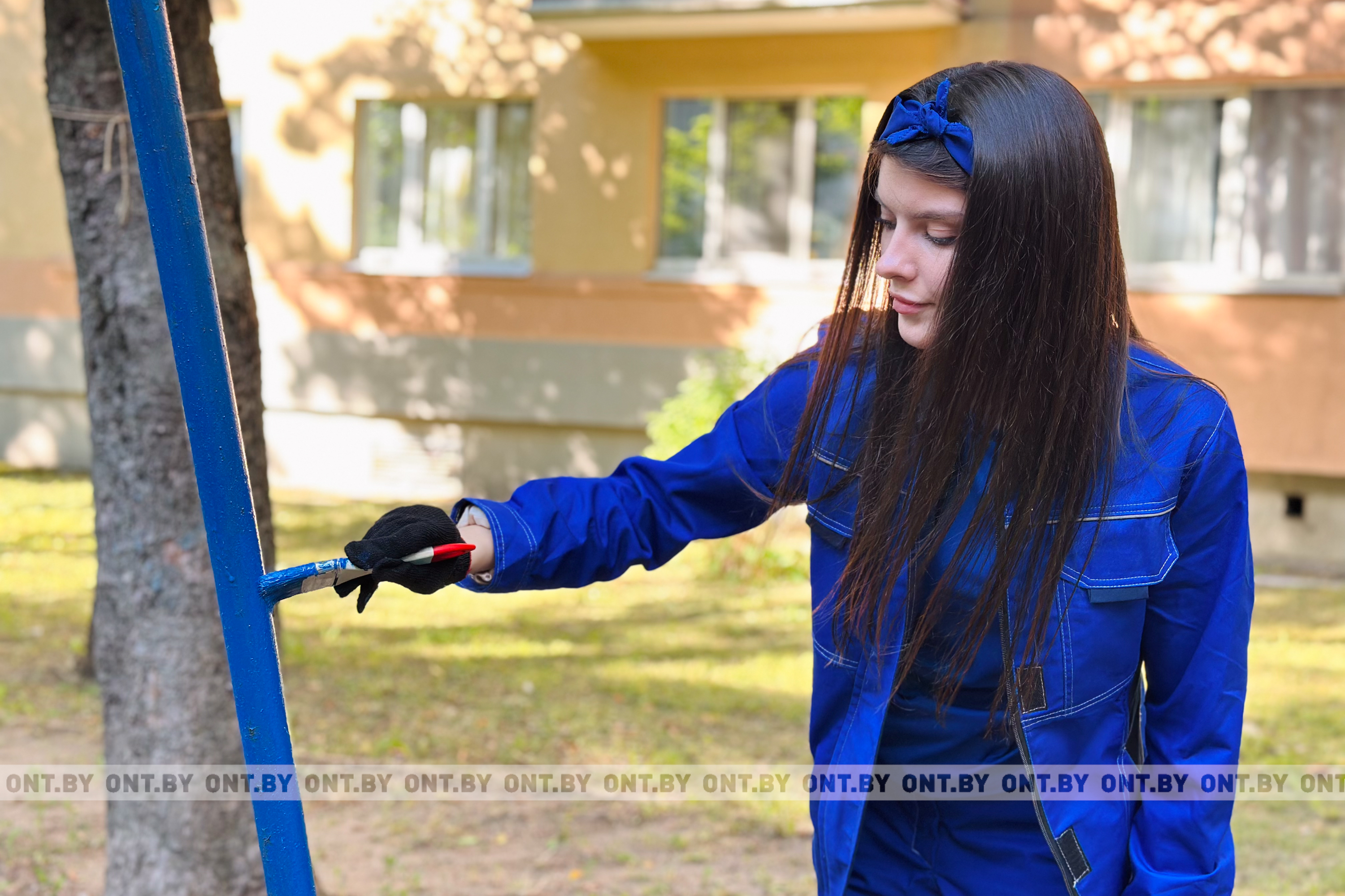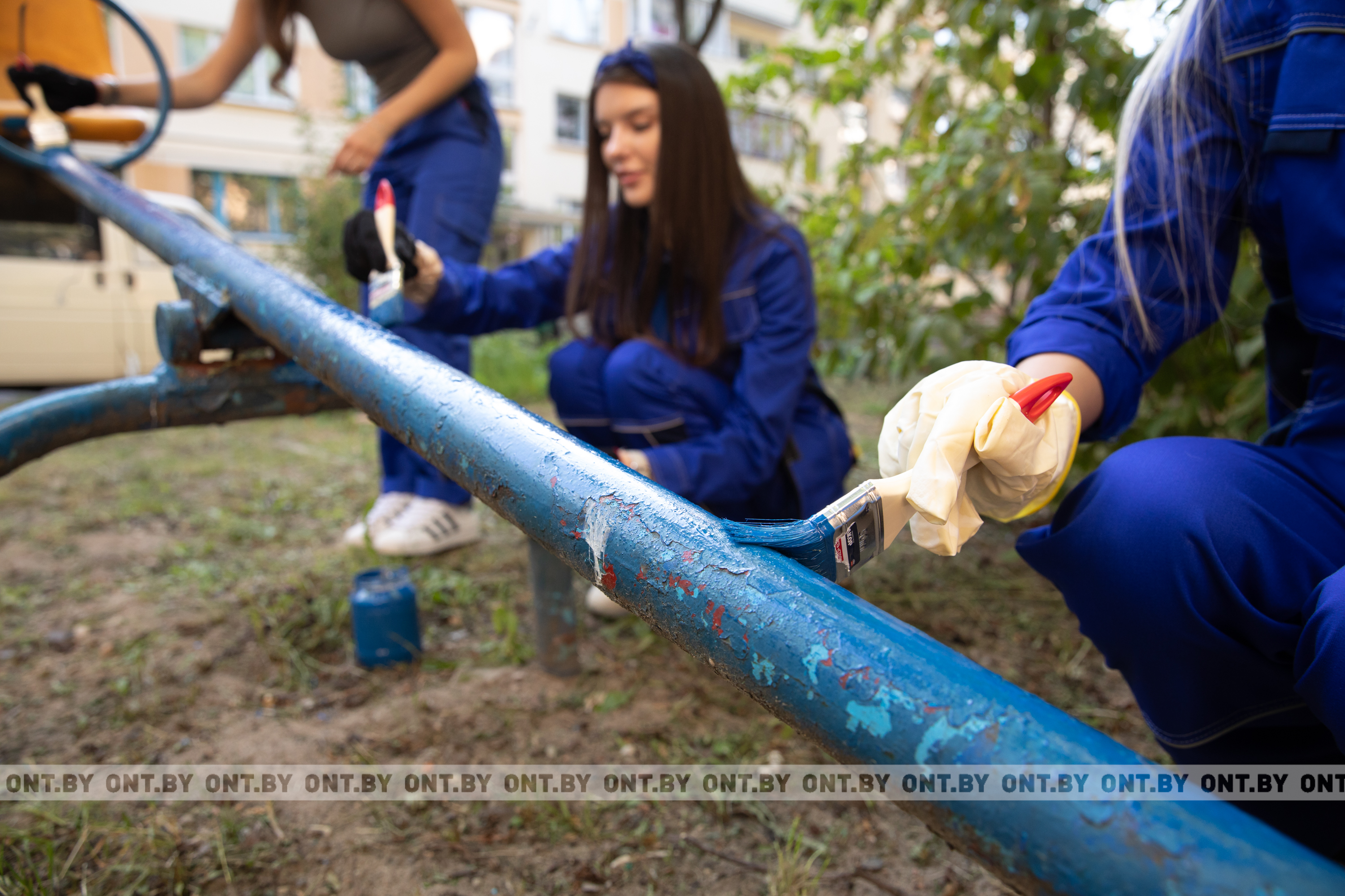 После этого участницы отправились в соседний дворик и принялись за покраску детской площадки и скамеек.