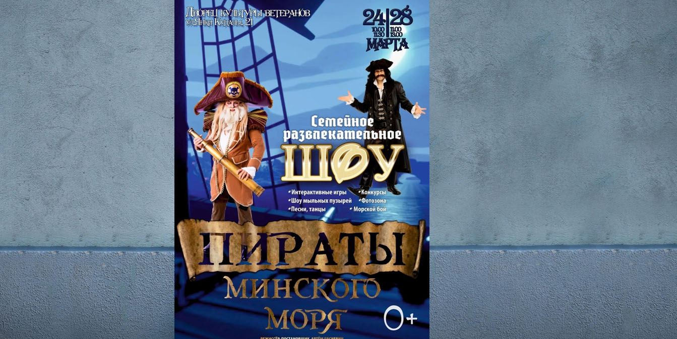 В столице в эти выходные есть чем увлечь детей. 28 марта во Дворце культуры ветеранов в 11:00 и 13:00 состоится развлекательное шоу «Пираты Минского моря». Взрослых и маленьких гостей ждут песни, танцы, шоу мыльных пузырей, конкурсы, игра в морской бой и интерактивная программа. Кроме того, у желающих будет возможность сделать фотосессию. Возрастных ограничений для посетителей нет.