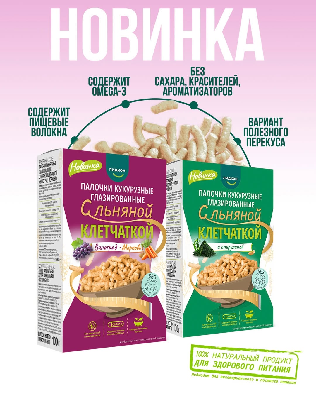 Линейка кукурузных палочек с льняной клетчаткой от «Лидкон» дополнилась двумя новыми вкусами – виноград-морковь и спирулина. Продукт содержит омега-3 и полезные пищевые волокна. Он отлично подходит для вегетарианского и постного питания.