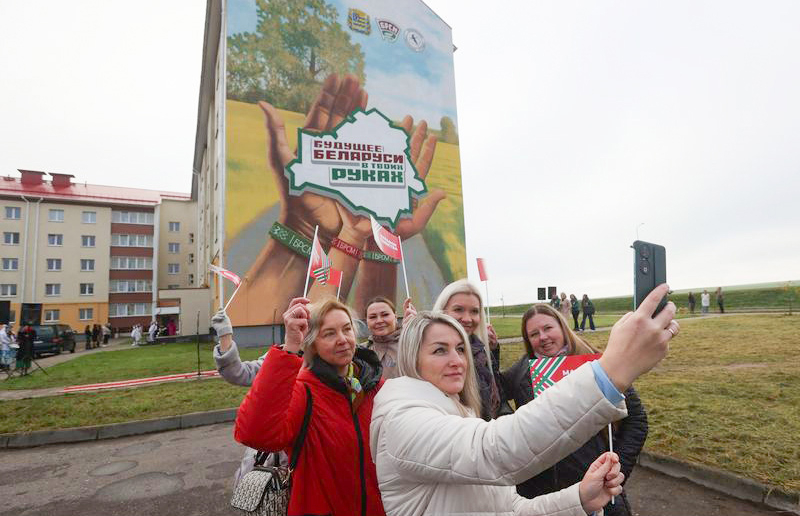 Второй день праздника начался с подарков. Один из домов молодого микрорайона теперь украшает арт-объект. «Будущее Беларуси в твоих руках» – такое название мурала. Карту с надписью на ладонях держит семья – мужчина, женщина и ребенок – это символизирует традиционные семейные ценности и наше стремление к сохранению мира. В этом доме живет немало многодетных: в одной семье воспитывается сразу 12 детей.
