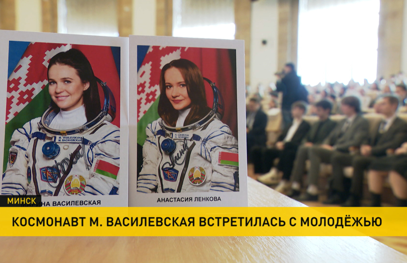О космической миссии из первых уст! Первая женщина-космонавт суверенной Беларуси Марина Василевская и ее дублер Анастасия Ленкова встретились с молодежью.
