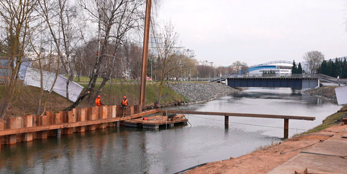 Александр Огер мастер участка № 8 предприятия «Минскметрострой»: «Создается защитный экран, чтобы мы могли работать ниже уровня воды. Готовим площадку под усиление русла реки Свислочь. Погружается шпунт, будем дальше осушать дно реки, выбирать лишний грунт, усиливать, заливать монолитную плиту, половину реки мы сейчас закрываем, выкачиваем воду, выполняем работы. Вторая половина будет открыта, потом меняем местами. Т.е. перезапускаем реку».