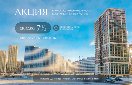 Сезон выгодных цен в известном многофункциональном комплексе столицы. До конца декабря 2025 года для покупателей всех видов недвижимости в комплексе «Минск-Мир» действует специальное предложение: при полной оплате в течение 7 календарных дней – скидка 7%!