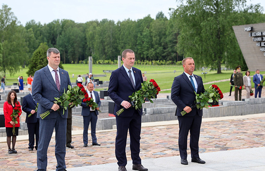 Глава области и представители Минского облисполкома возложили цветы к скульптуре Непокоренному человеку. Память погибших они почтили минутой молчания у Вечного огня.