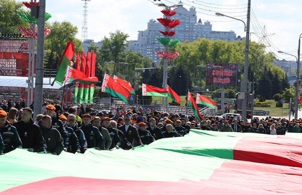 В рамках празднования прошло шествие с самым большим флагом Беларуси – полотнищем 500 метров длиной и 9 метров шириной. Вес Государственного флага – свыше 400 кг.