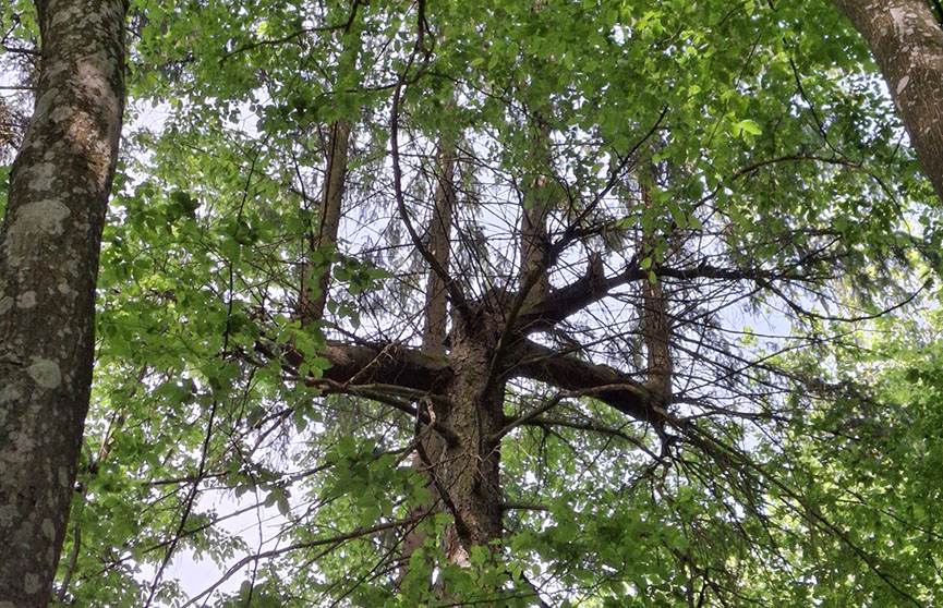 В пуще была найдена необычная ель-четырехзубец. Обычно у елей одна верхушка. У этой же ствол в одном месте как бы разветвляется на четыре «самостоятельных» дерева.