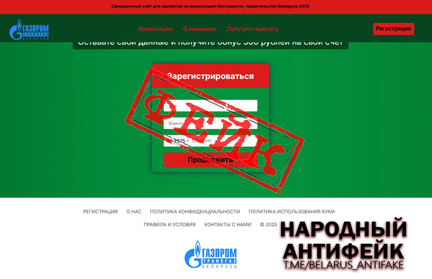 Как сообщает Telegram-канал «Народный антифейк», новая реклама сказочного обогащения гуляет по интернету. Заработать деньги предлагает инвестиционная платформа «Газпром трансгаз Беларусь». Это фейк!
