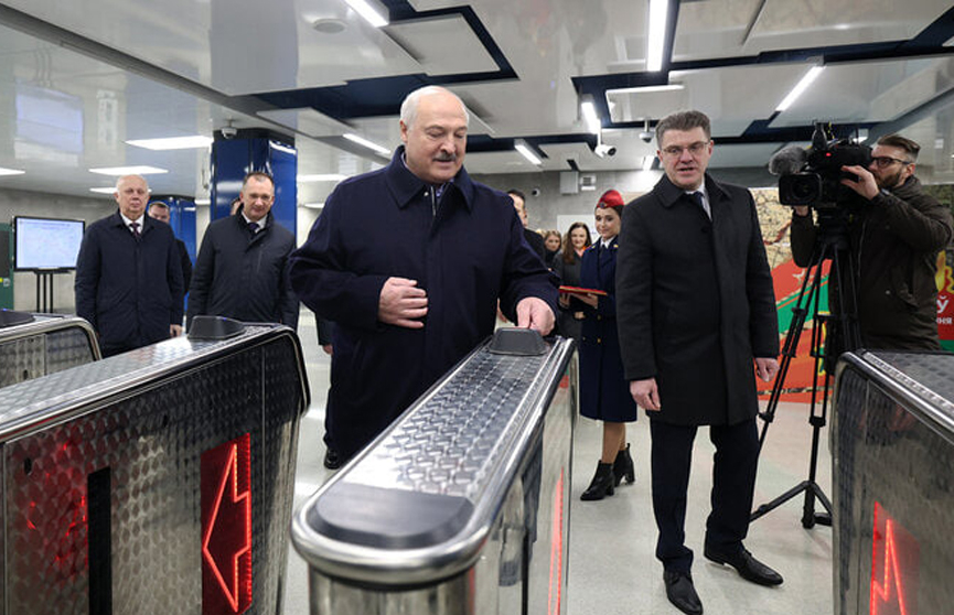 Александр Лукашенко и сопровождающие его лица сделали первый рейс по новым станциям третьей линии: «Слуцкому гостинцу», «Немаршанскому саду», «Аэродромной».