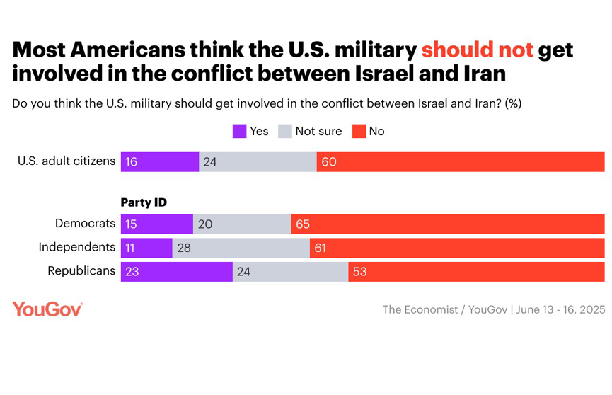 Как показывают данные опросов, более половины жителей США выступили против вмешательства американской армии в конфликт между Израилем и Ираном. Это следует из опроса компании YouGov и журнала Economist.