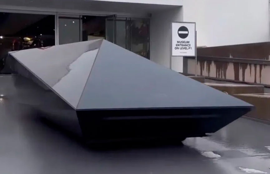 Yeezy Cybertruck выглядит как некая пирамида без видимых внешних атрибутов классического авто, задний стоп-сигнал напоминает «стопы» машины из фильма «Рыцарь дорог».