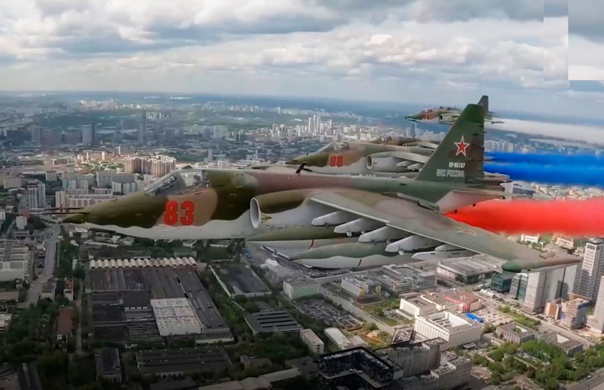 Завершающим аккордом технического парадного строя стала авиация. «Русские витязи» на Су-30СМ и «Стрижи» на МиГ-29, а также штурмовики Су-25 пролетели над Красной площадью в Москве.