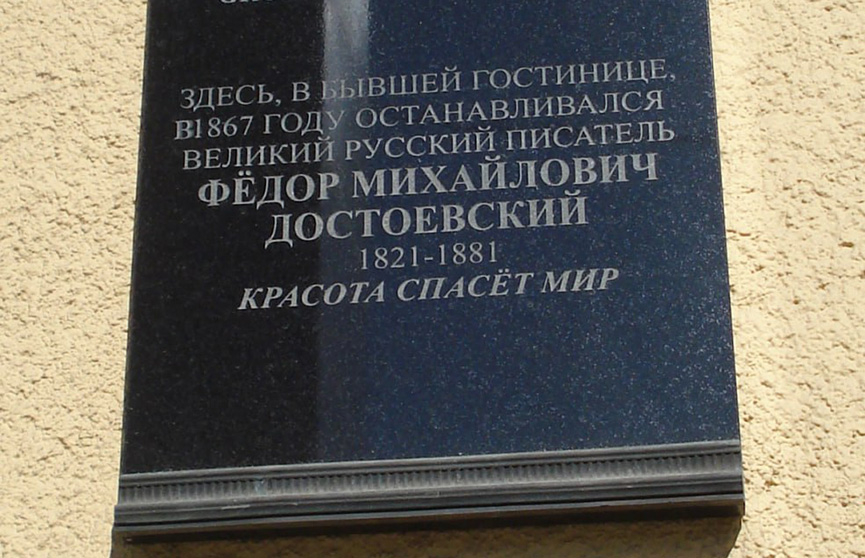Отмечается, что доска висит на здании гостиницы «Ганна», где в 1867 году Достоевский останавливался со своей женой. Помимо этой информации на таблицу нанесена фраза «Красота спасет мир» из романа «Идиот», автором которого является писатель.