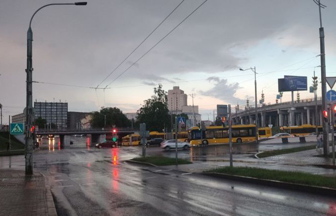 В Минске в результате прохождения грозового фронта фиксировались частичные подтопления участков дорог.