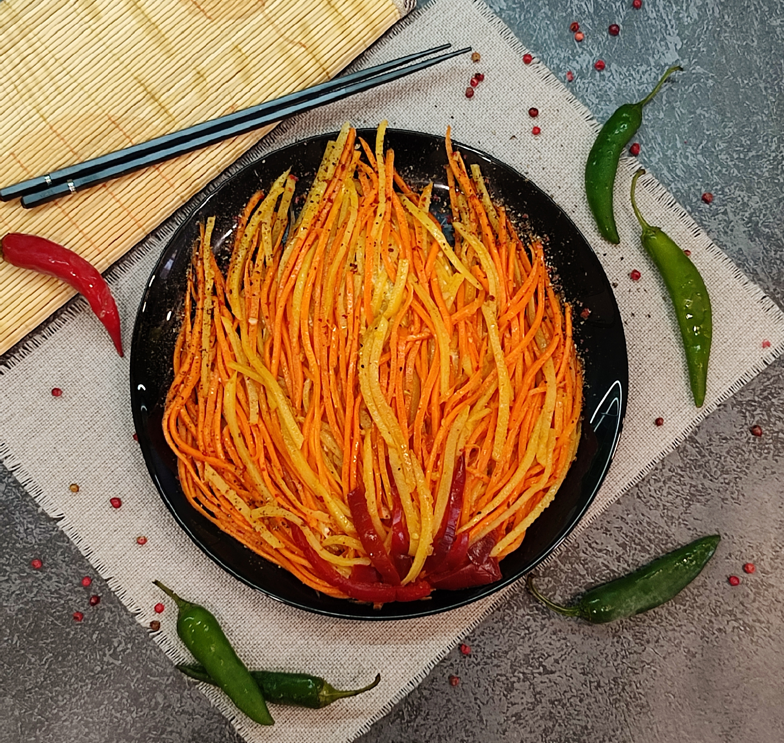 Для украшения красный и желтый перец нарезать тонкими полосками и выложить из них «огненное дыхание».