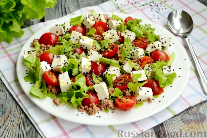 Нам понадобится: 1 банка консервированного тунца, 10-12 помидоров черри (можно взять и обычные), 1 пучок листового салата, 50 г сыра фета, 1 ст. л. оливкового масла, 1 ст. л. лимона, 1/3 ч. л. соли, щепотка молотого перца, 1 ч. л. черного кунжута.