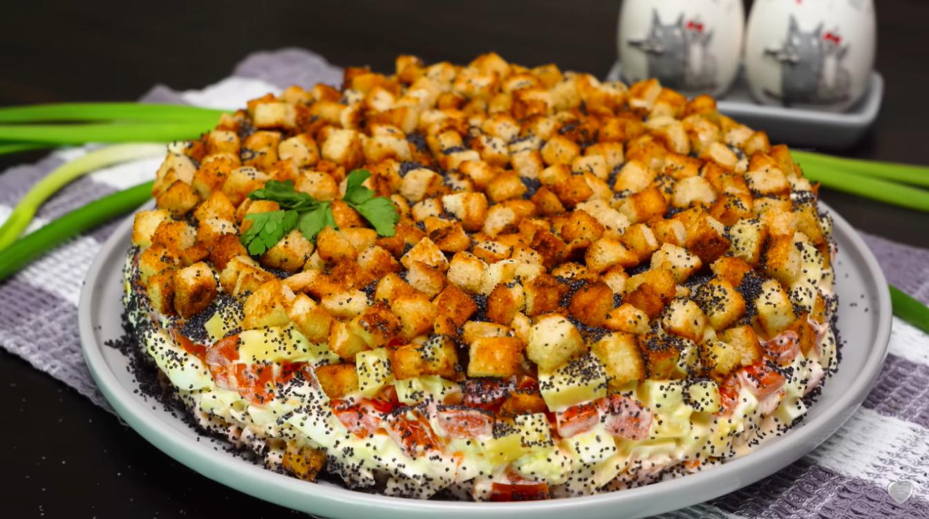 Этот салат можно делать и не слоеным, а перемешать все ингредиенты и украсить сухариками.