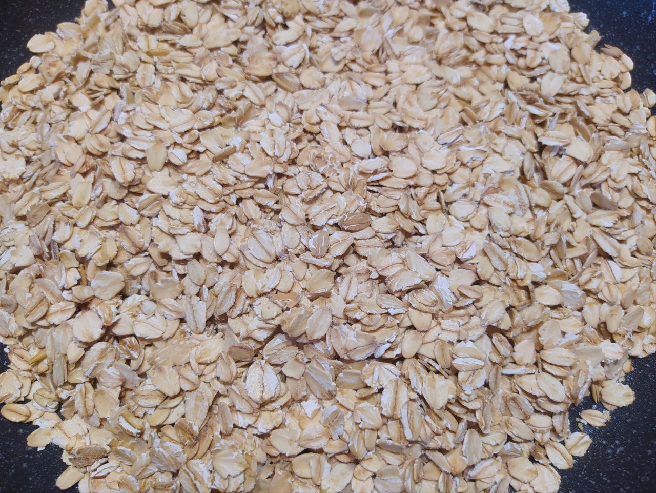 1. Овсяные хлопья высыпать в сухую горячую сковороду и подсушить в течение 10 минут, постоянно помешивая. Остудить.