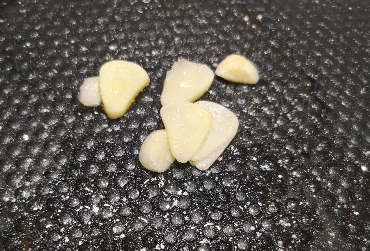1. В сковороду налить немного растительного масла, добавить в него дольки чеснока и обжарить. Когда чеснок отдаст свой аромат, достать его.