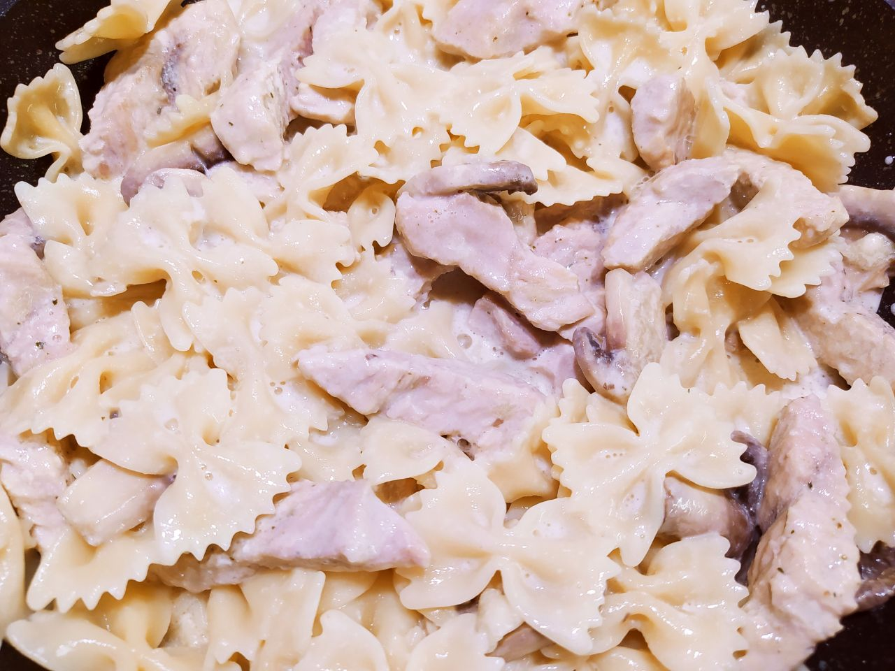 6. Добавить пасту к индейке и грибам. Перемешать.