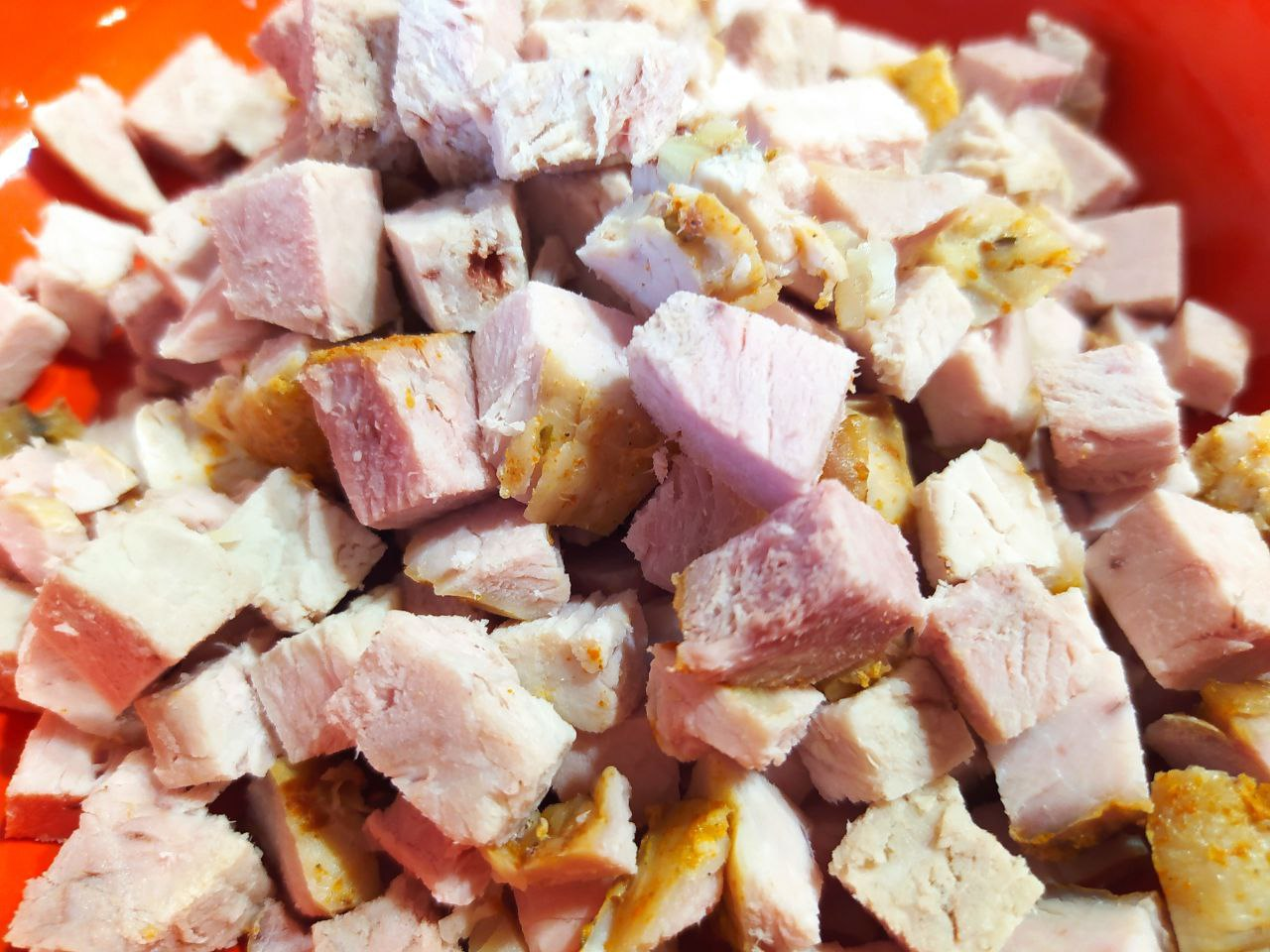 1. Свинину сварить, остудить, нарезать кубиками.