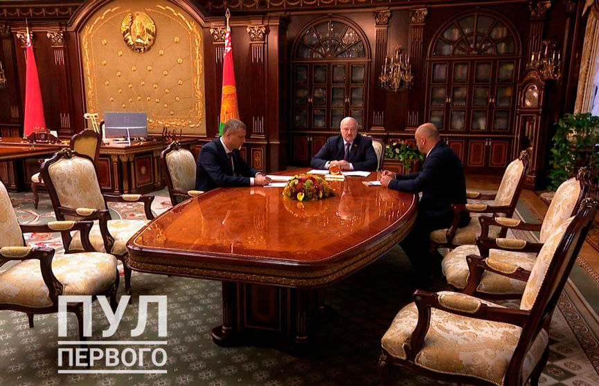 Президент Беларуси Александр Лукашенко принимает с докладом главу Администрации Президента Дмитрия Крутого и Чрезвычайного и Полномочного Посла Беларуси в России Александра Рогожника, передает БЕЛТА.