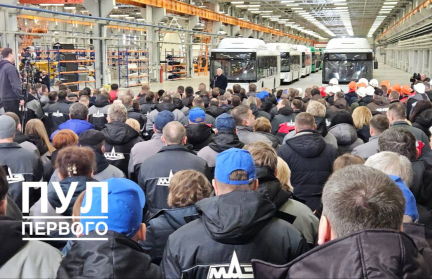 Президенту Республики Беларусь Александру Лукашенко во время его сегодняшнего пребывания на МАЗе от имени коллектива Минского автомобильного завода прямо в цеху подарили автобус.