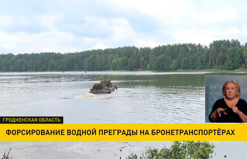 Гвардейцы на БТР преодолевают водную преграду. Река широкая и быстрая, но вход и выход из воды с разных берегов надо произвести без остановки машины.