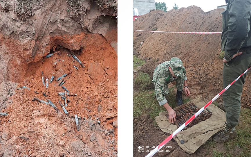 Сотрудники милиции, специалисты саперно-пиротехнической группы войсковой части №7404 и спасатели прибыли к месту происшествия. 80 20-миллиметровых снарядов, которые во времена войны использовались для немецких пушек Flak, нашли в земле саперы.