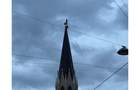 На опубликованных кадрах видно, как молодые люди карабкаются по конструкции храма, добираясь до креста на вершине шпиля. Добравшись до цели, они устроили фотосессию, удобно расположившись на узкой конструкции. В завершение один из подростков встал в полный рост и продемонстрировал характерный жест – «козу».