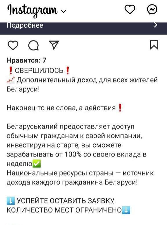 Мошенники в соцсетях от имени «Беларуськалия» предлагают «легкий доход»